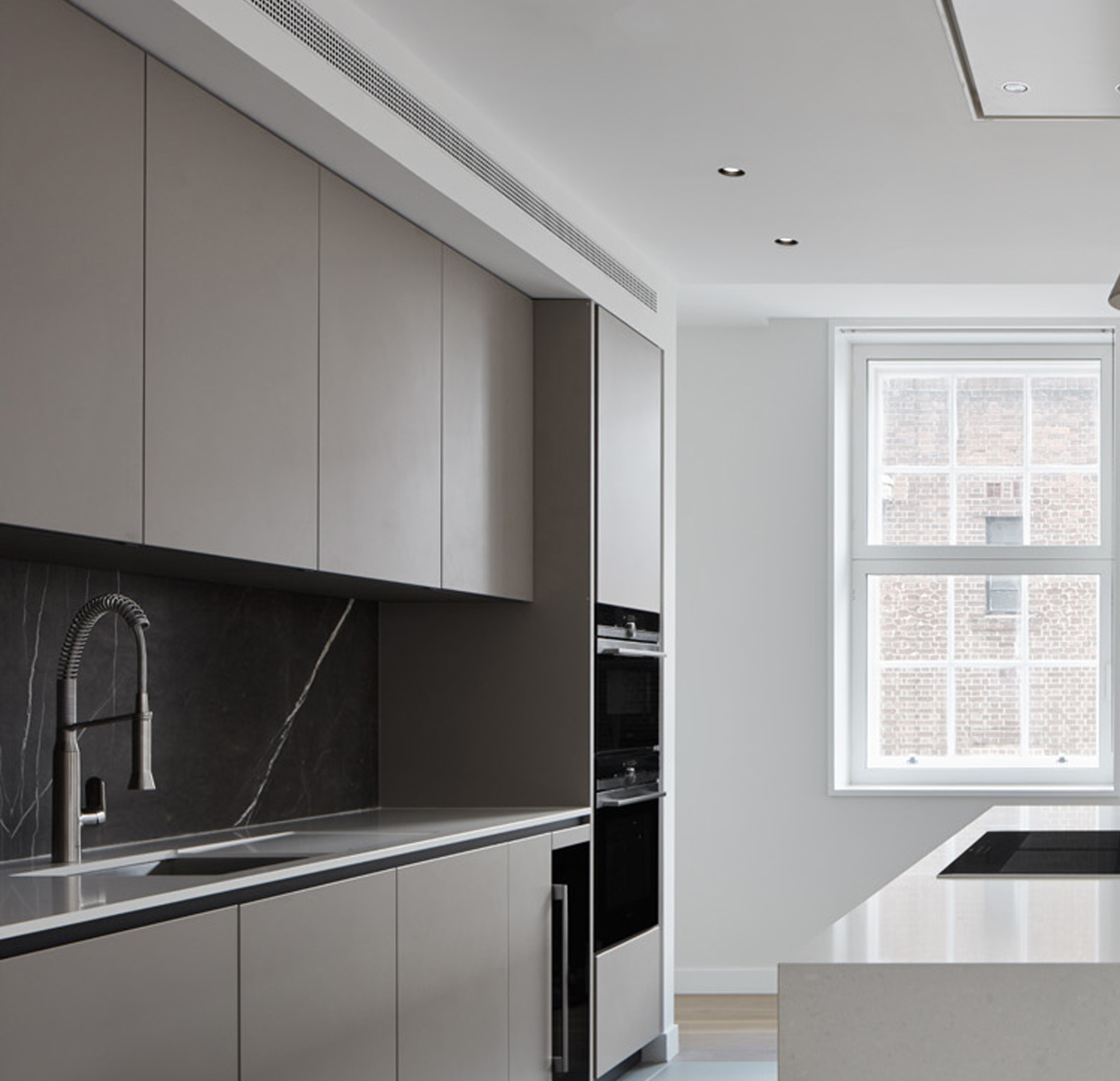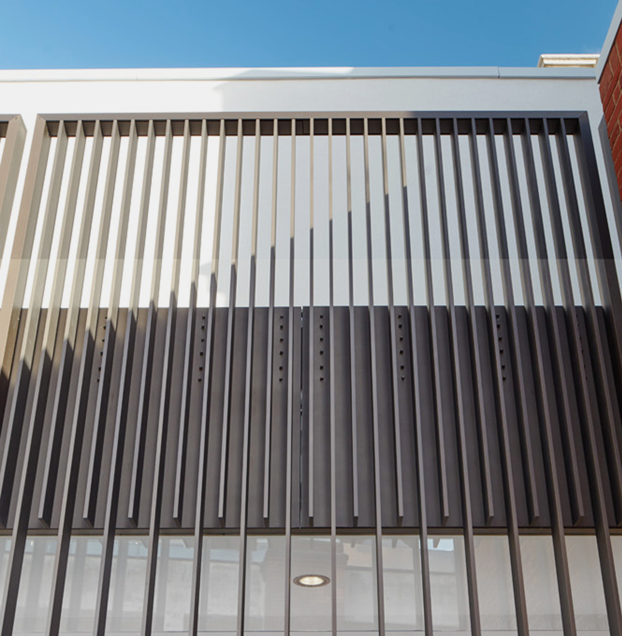 The design of the new infill takes cues from the proportions and horizontal features of the listed bank and adjacent ‘townhouse’ facades and has used these to inform the design of the new facade. It respects the classical hierarchy, vertical rhythm and three bay subdivision that are clearly expressed in the listed facades. The brick choice, a Gloucester Grey, provides a tonal distinction to the new building whilst mediating between the two different adjacent red buildings.