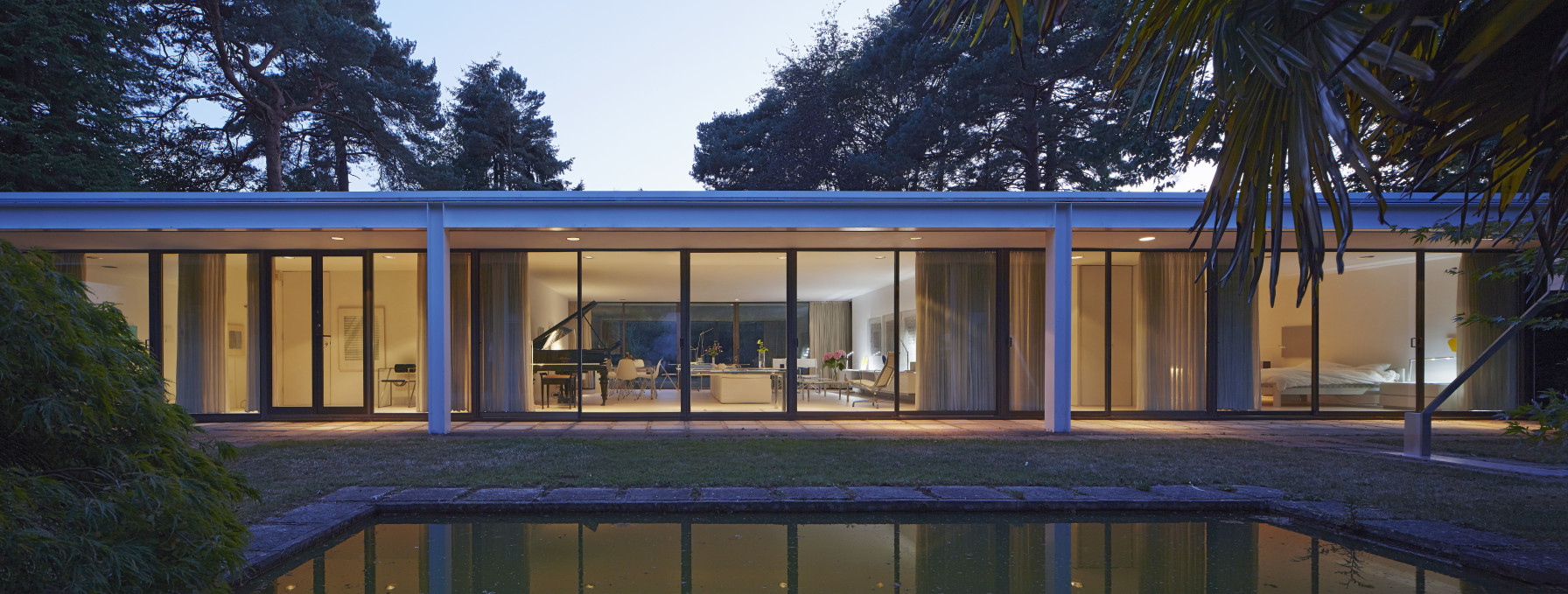 Set in a wooded landscape, the house is approached via a long drive lined with pine trees. A long white screen wall signals arrival at the house. A narrow doorway leads into the walled courtyard providing the first full view of the house and the reflecting pool. The main entrance to the house is through the glazed façade set back from the simple steel frame. On the other side of the house is a simple Rhododendron garden. The east-west orientation of the spaces in the house provides gently balanced light.