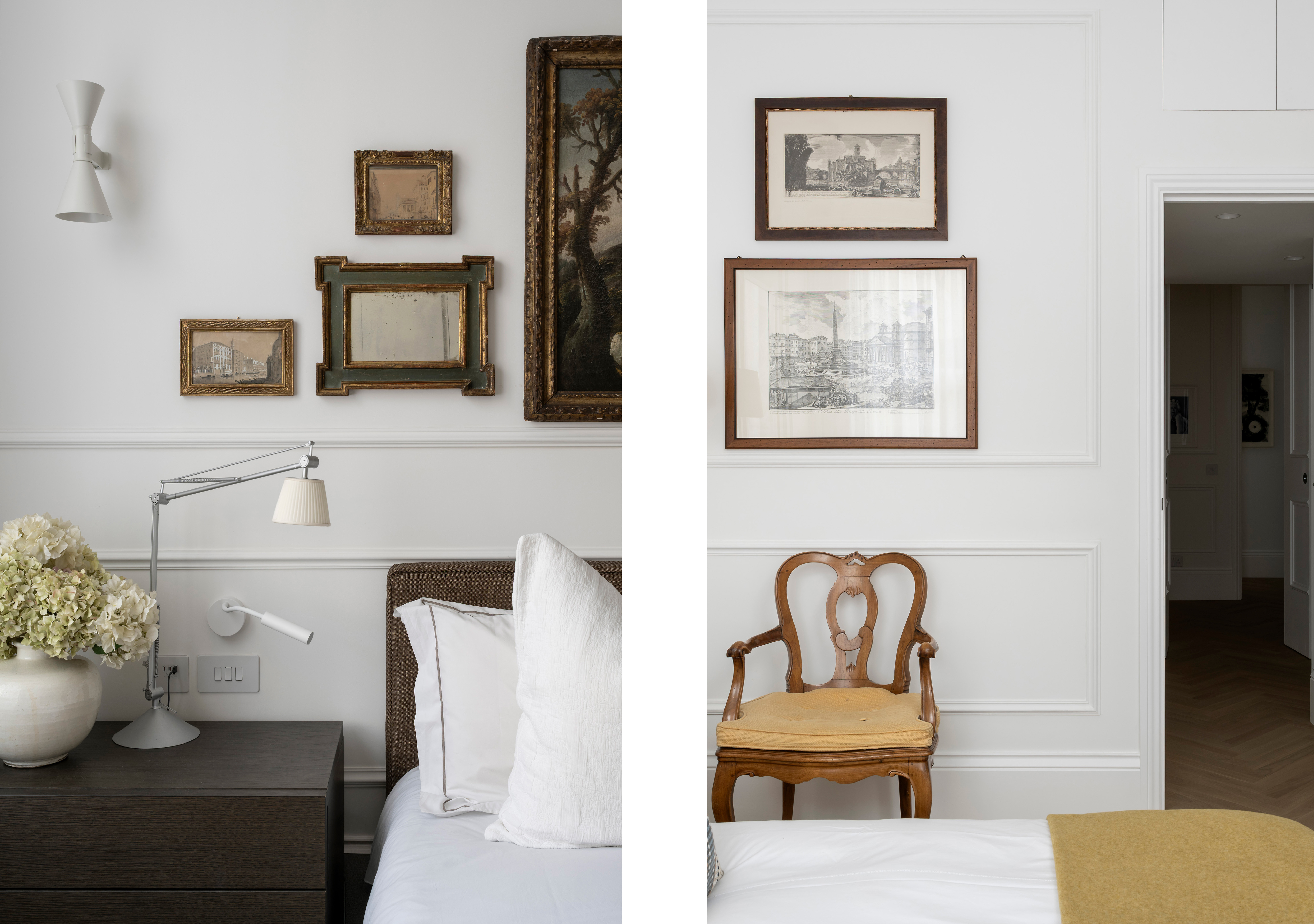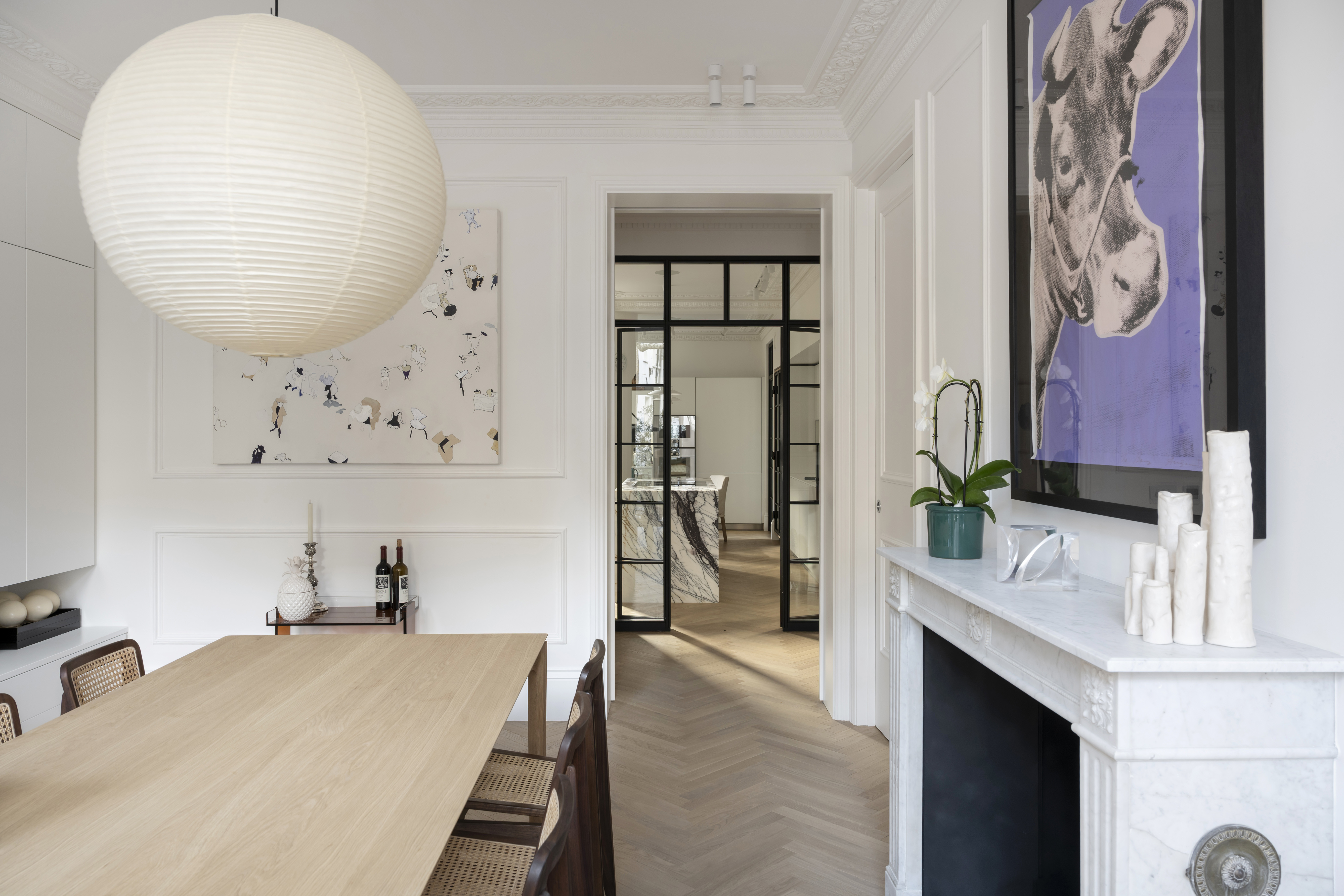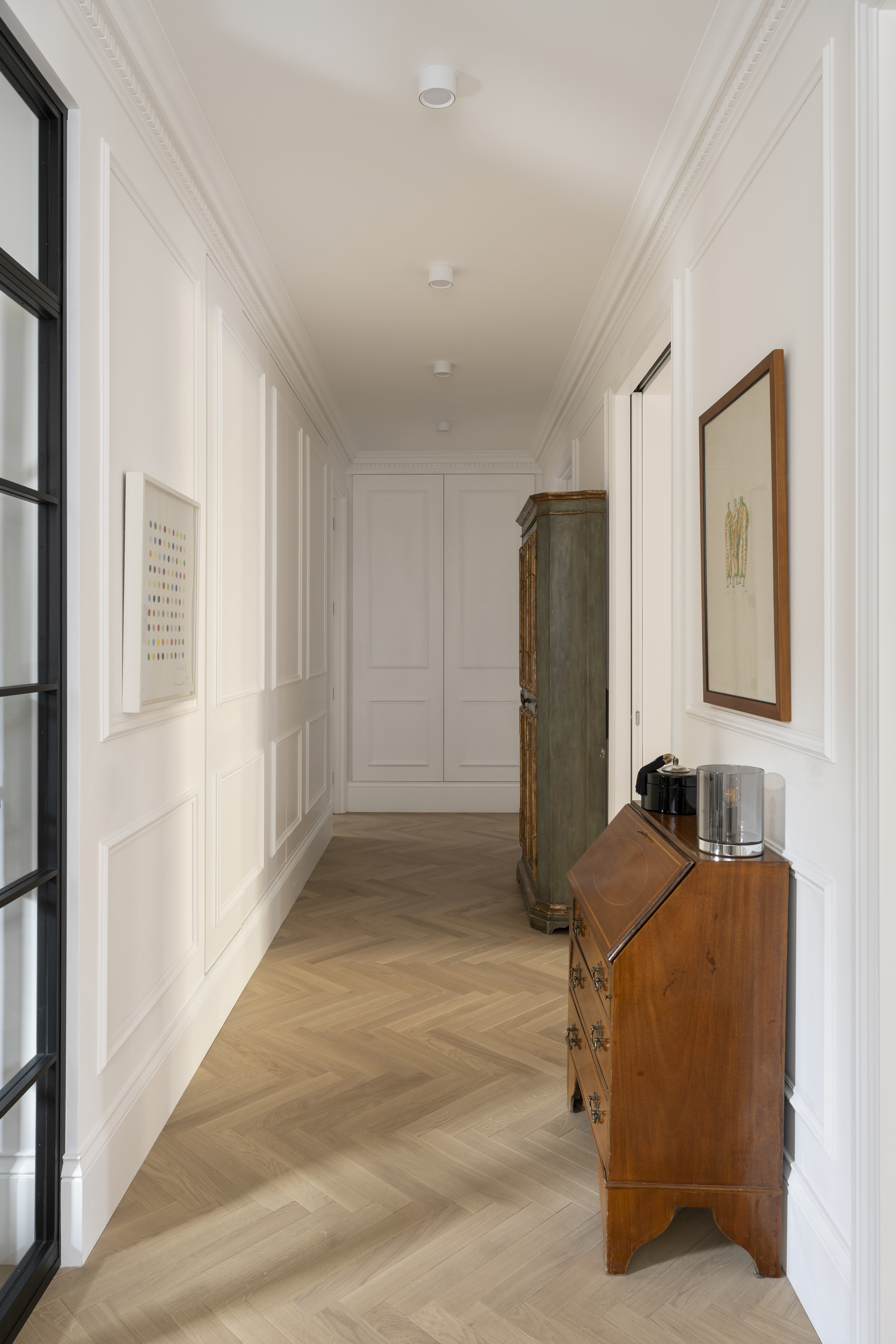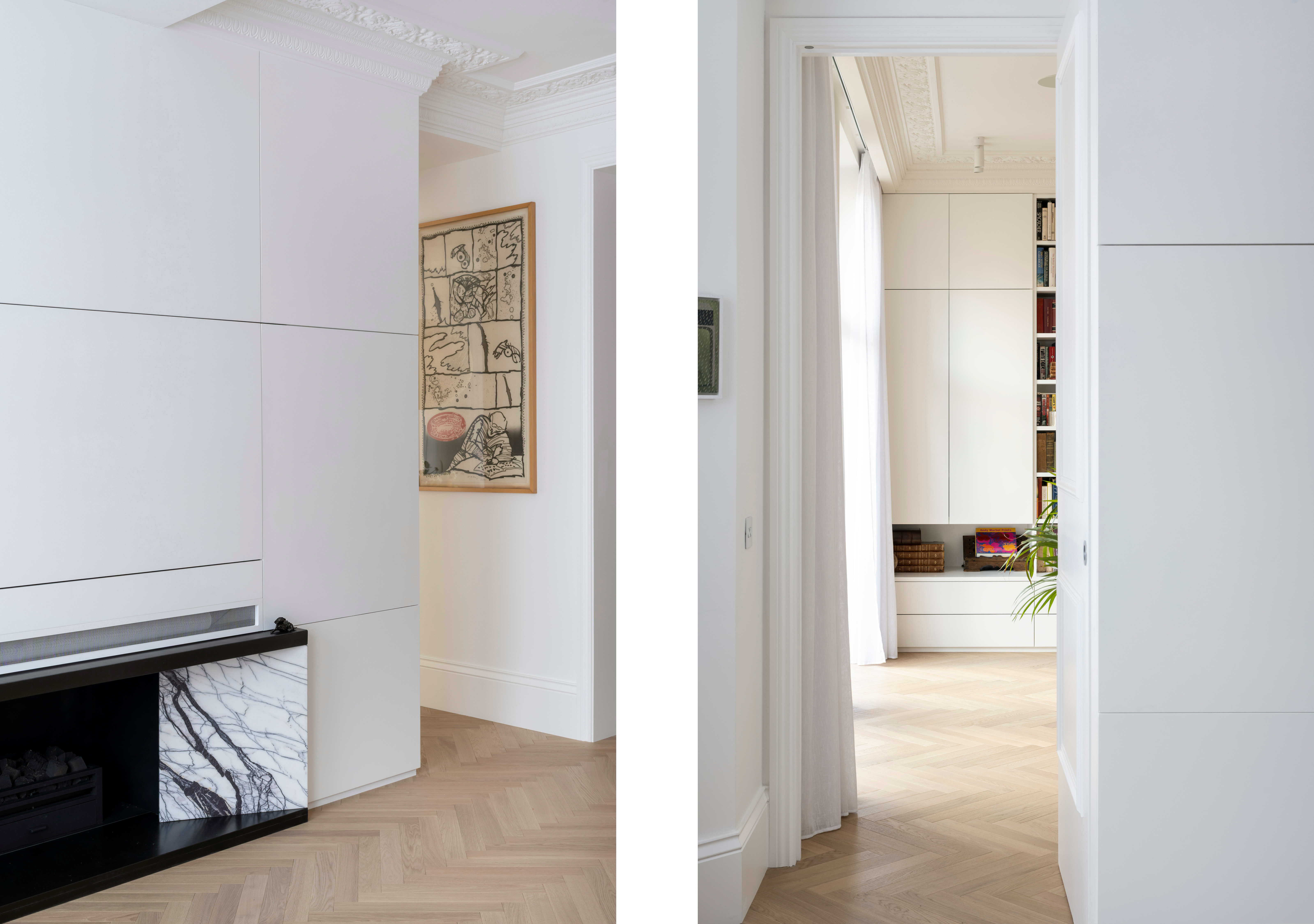 A key element of the project was the introduction of underfloor heating, improving both comfort and spatial cleanliness by removing the need for visible radiators. New flooring was installed across the entire apartment, featuring a continuous herringbone timber floor, which unifies the spaces and provides a timeless foundation to the overall design scheme.