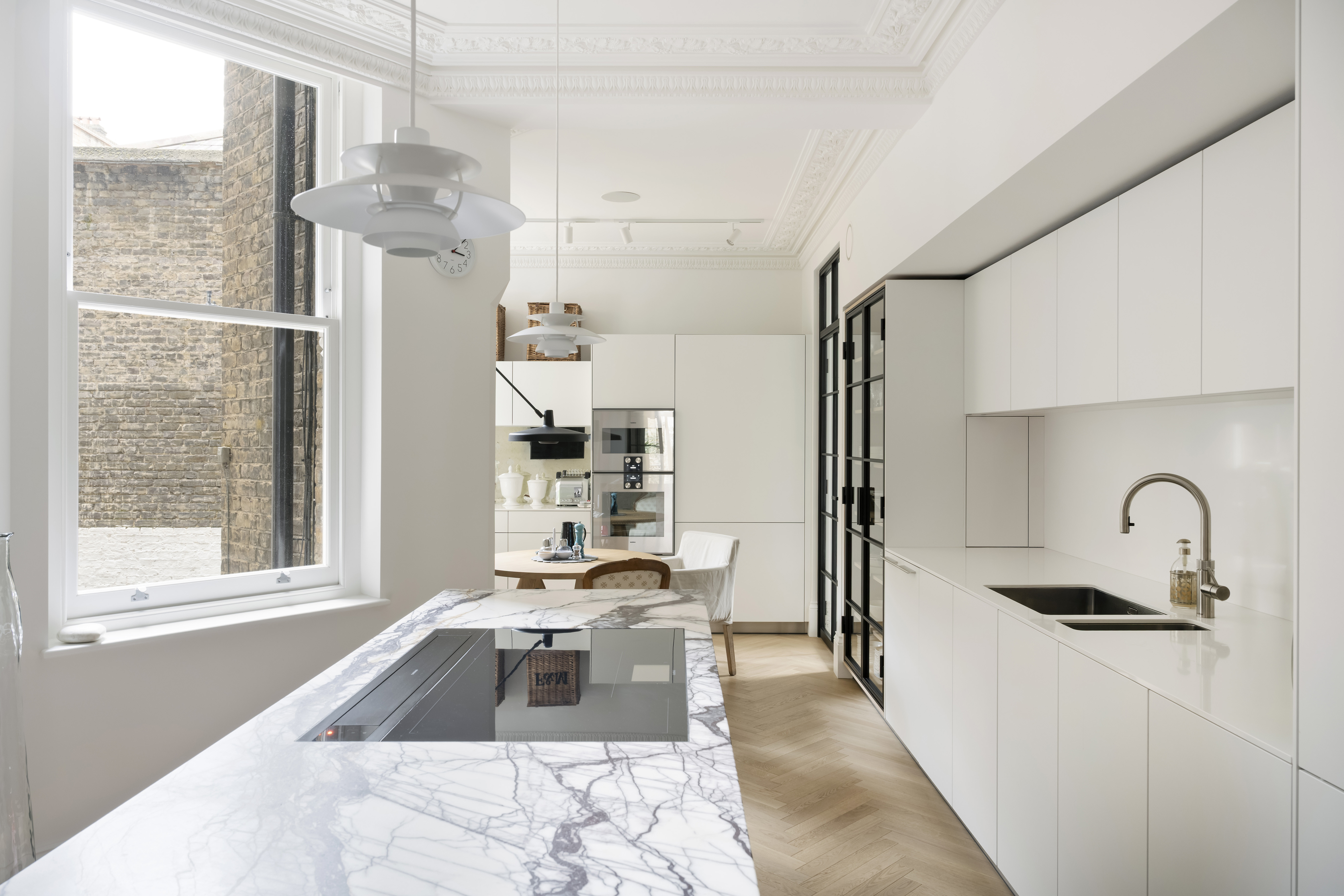 The refurbishment also incorporated the installation of new windows, requiring planning approval due to the conservation area setting. These upgrades significantly improved the property’s U-values and overall energy efficiency, enhancing thermal performance while maintaining architectural sensitivity. A carefully considered combination of Crittall-style glazing and traditional sash windows ensured the apartment retained its heritage character while benefiting from modern detailing.